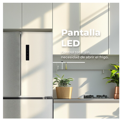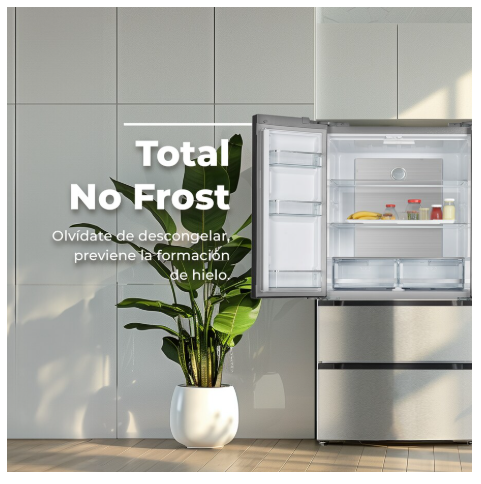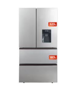 Este frigorífico con cajón francés cuenta con una impresionante capacidad de 506 litros, sistema No Frost para evitar la formación de capas de hielo, tecnología Multi Air Flow para mantener una temperatura uniforme, dispensador de agua fría, acabado de calidad en Inox para realzar la estética de tu cocina, tecnología LECO que elimina bacterias y malos olores, motor Inverter para un rendimiento eficiente y silencioso, rápido sistema de enfriamiento y congelación, elegante pantalla de control y un modo de vacaciones que ahorra energía cuando no estás en casa. Medidas: 183 x 83,6 x 71 (cm)
